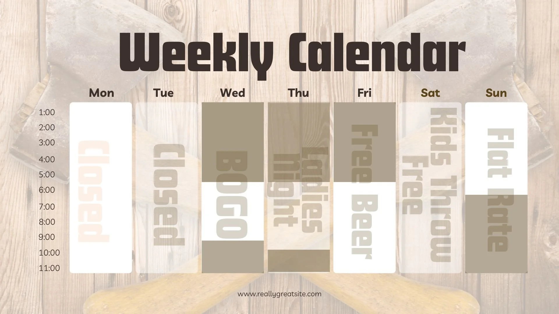 "We have something for everyone throughout the week! On Wednesdays, enjoy a special deal—buy one hour of throwing and get an extra hour free. Thursdays are for the ladies, with half-price throwing, karaoke, and all-you-can-eat tacos for just $9.99. Kick off the weekend with Free Beer Friday—get your first beer on the house with the purchase of an hour of throwing. Saturdays are perfect for family fun, as kids throw free with the purchase of an adult pass. Wrap up the week with Flat Rate Sunday—just $99 for an hour in a pit for up to six people. No matter the day, there’s always something exciting at here at our establishment!"